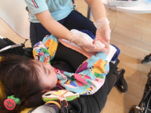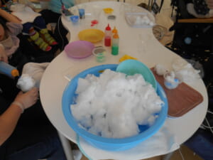 2月8日(日)は前日に降った雪がテラスにたくさん積もったので、みんなで『雪遊び』をしました。 冷たい雪をさわって驚いて目を大きくしたり、気持ちよさそうな表情でさわったり・・・子ども達も色々な表情で雪を体験しました。 雪を透明カップに入れた後に絵の具をシロップに見立てて『かき氷』や『ドーナツ』を作ってみんなで楽しく遊びました! 保育士